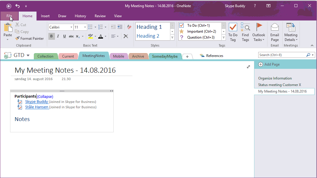 I send all my meeting notes to the Meeting section in OneNote where I have notes from workshops, meetings and Skype for Business calls sorted by customer. It is a great way for taking notes and creating tasks right away and a good source material for followup emails and actions. You can also send your Skype meetings to OneNote, but then you lose the agenda, but you gain an updated attendee list